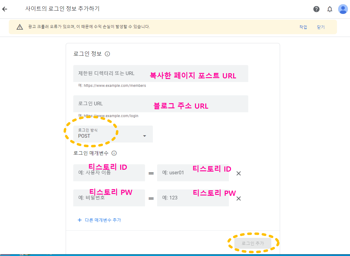 3. 로그인 정보에서 아래와 같이 기입을 하고, 로그인 방식 (POST) 로 변경 > 로그인 추가 클릭