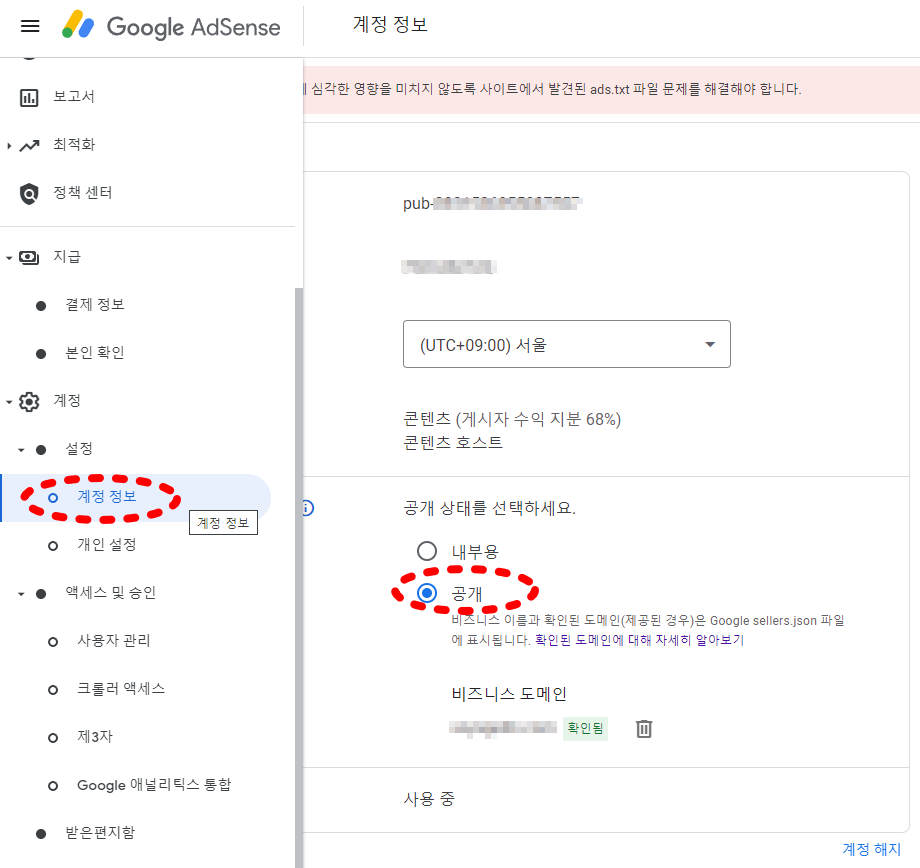 | 구글 애드센스(Google ADsense) 문제해결 방법 - 수익 손실 위험 - 수익에 심각한 영향을 미치지 않도록 사이트에서 발견된 ads.txt 파일 문제를 해결해야 합니다. (0) | 2023.07.05 |