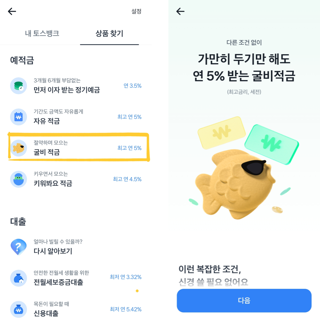 1. 토스뱅크 앱 > 상품 찾기 > 굴비 적금 > 다음