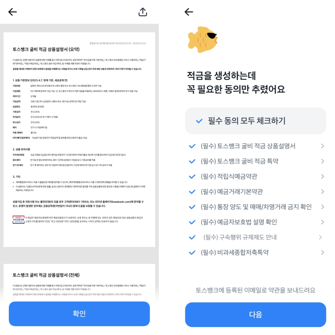 필수 동의 모두 체크하기 클릭 > 토스뱅크 굴비 적금 상품설명서(요약) 확인 > 동의화면 다음