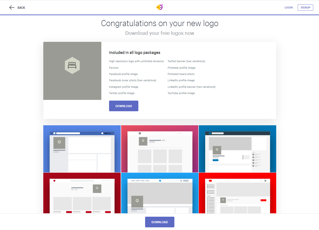 위 로고가 완성된 화면에서 [DOWNLOAD] 버튼을 클릭하면 완성된 로고의 다양한 사이즈 버전을 다운로드를 할 수 있습니다.