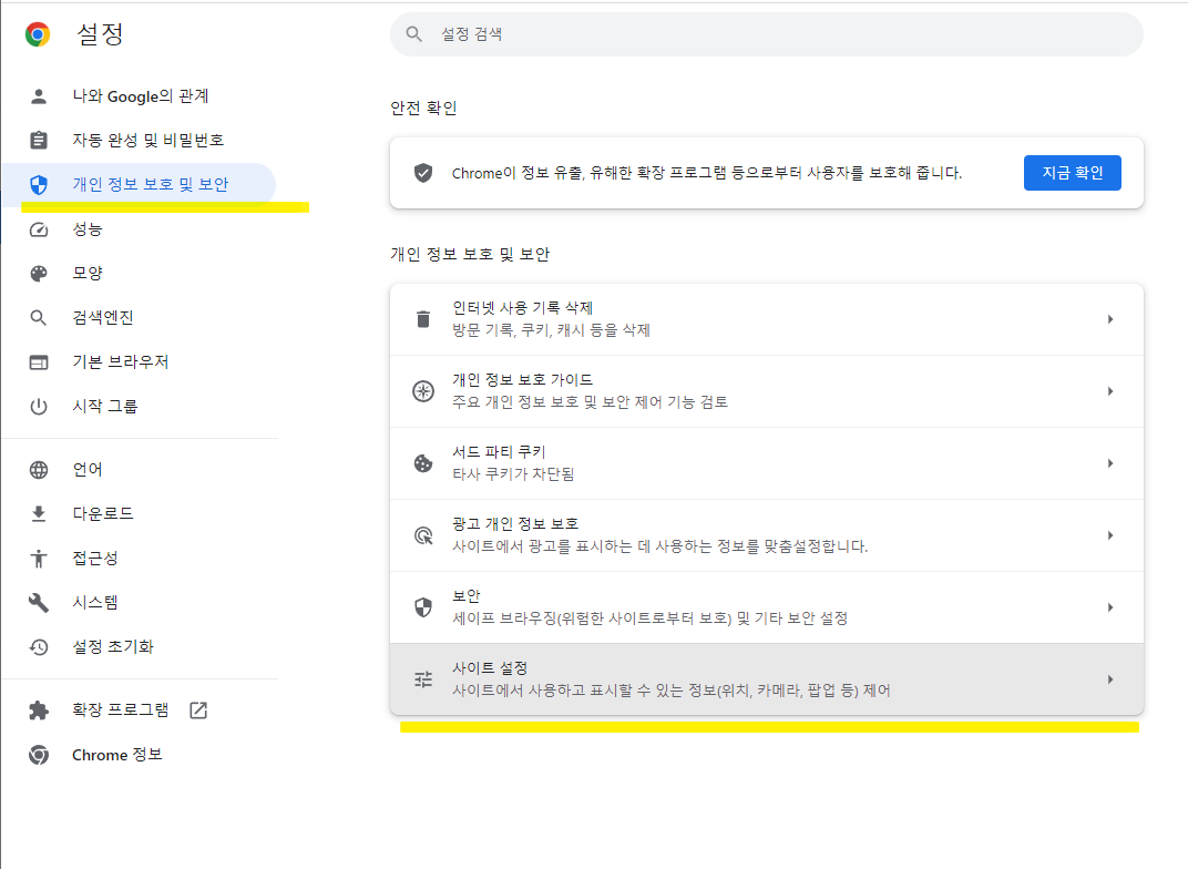 ② 설정 > 개인 정보 보호 및 보안 > 사이트 설정
