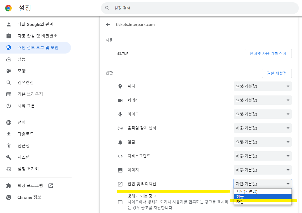 ⑤ 설정 > 개인 정보 보호 및 보안 > 팝업 및 리디렉션 > 차단을 허용으로 변경