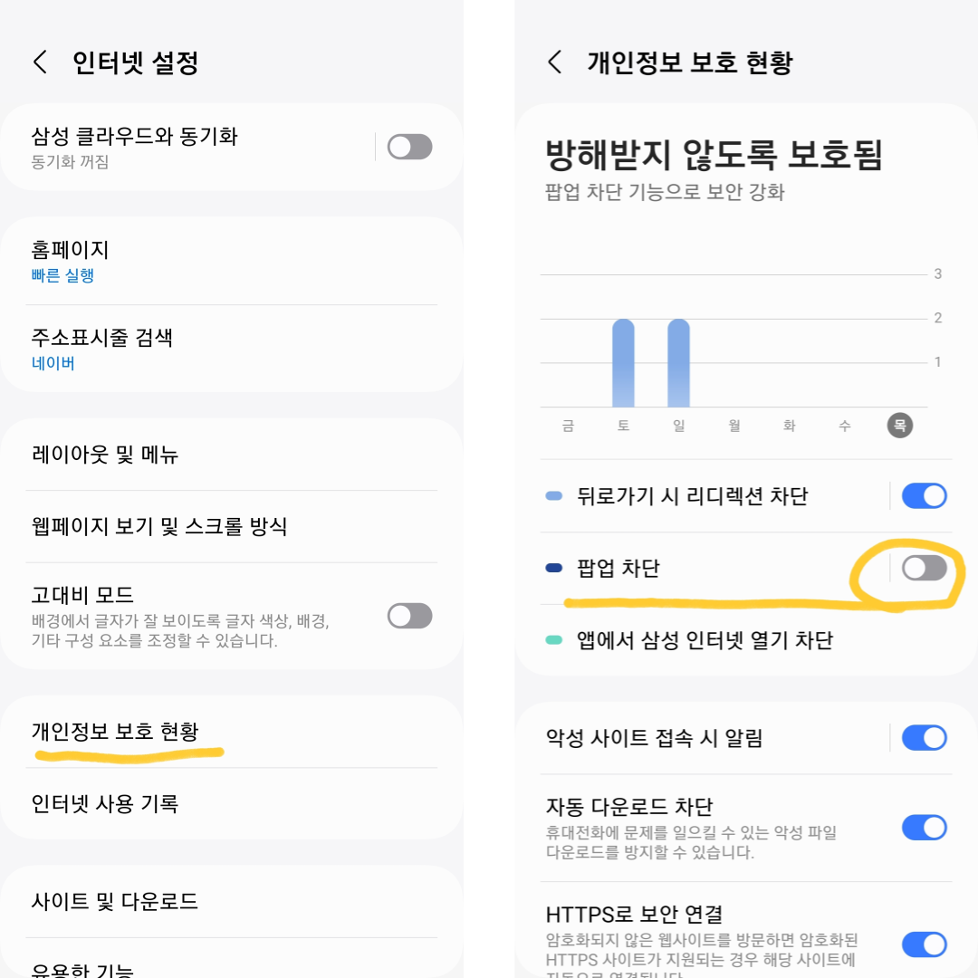 ③ 개인정보 보호 현황 > 팝업 차단 > 해제 (회색)
