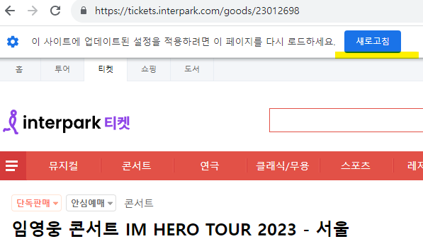 ⑥ 다시 임영웅 티켓 예매 화면으로 돌아오면 > 이 사이트에 업데이트된 설정을 적용하려면 이 페이지를 다시 로드하세요. 새로고침을 클릭