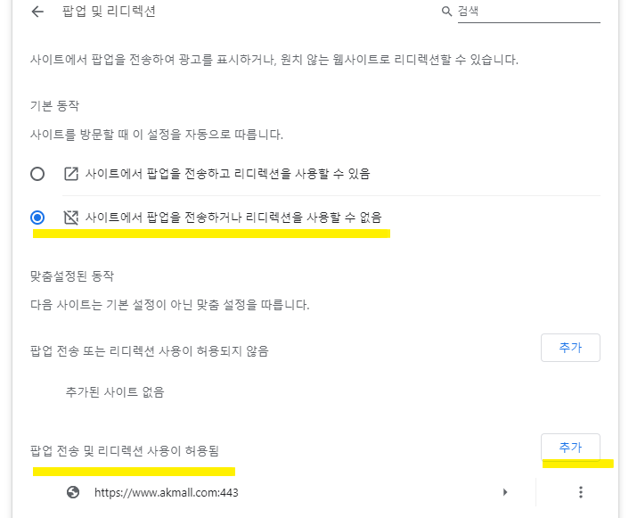 ④ 팝업 및 리디렉션 > 사이트에서 팝업을 전송하거나 리디렉션을 사용할 수 없음(기본설정) > 팝업 전송 및 리디렉션 사용이 허용됨 > 추가