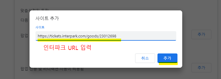 ⑤ 사이트 추가 > 임영웅 콘서트 예매 페이지 URL 복사해서 입력 or 인터파크 URL (상세페이지 아닌 홈페이지) 입력 > 추가 > 하단 목록에 추가 확인 > 완료