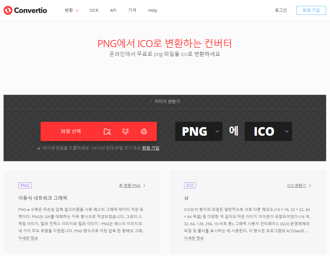 컨버티오 에서는 PNG 파일을 ICO로 변환하는데 무료입니다.