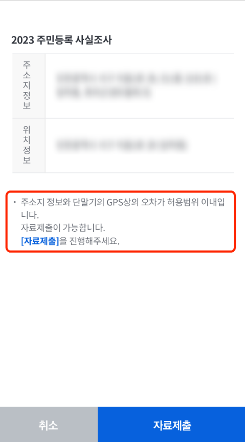 제대로 된 위치에서 확인이 되면, 아래와 같이 자료제출 버튼 클릭이 가능합니다.
