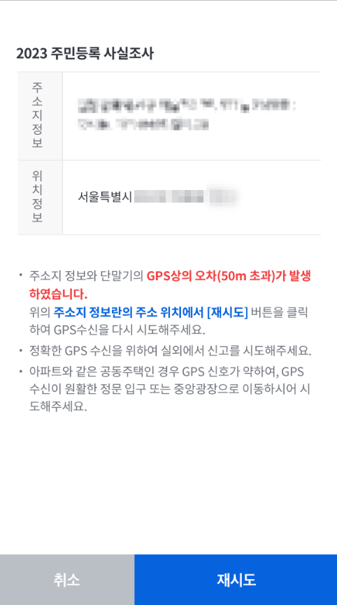 주소지 정보와 단말기의 GPS상의 오차가 발생하였습니다. > 재시도