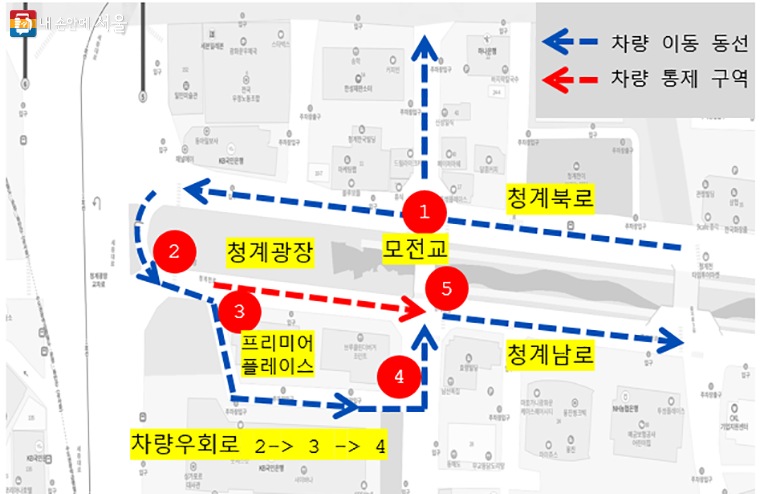 통제 구간 : 청계남로 일부 구간인 세종대로 방향 청계광장 입구 ~ 모전교 앞